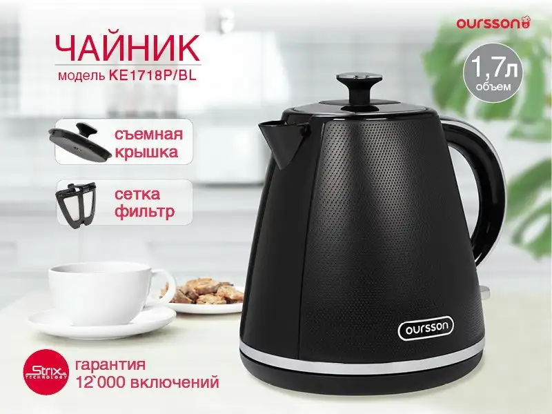 Электрический чайник Oursson KE1718P/BL изготовлен из прочного пластика и имеет объем 1,7 литра. Он быстро нагревается благодаря мощности 2200 Вт, что позволяет быстро вскипятить воду. Корпус черного цвета легко впишется в любую кухню, а вращающаяся подставка делает использование удобным. Внешний уровень воды расположен возле ручки, что облегчает контроль за уровнем воды. Минимальный уровень воды составляет 0,5 литра, что подходит для небольших порций. Вес устройства всего 930 грамм, что обеспечивает его легкость и удобство в использовании. Управление механическое, простое и надежное. Корпус не оборудован подсветкой, индикатором температуры или функциями поддержания горячей воды. Этот чайник подходит для домашнего использования и не рассчитан на работу в режиме сопряжения с умным домом или в поездках.