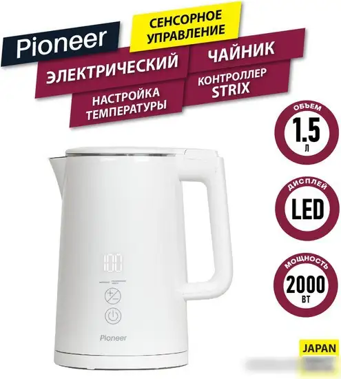 Электрический чайник Pioneer KE577M имеет белый корпус из пластика и внутреннюю колбу из нержавеющей стали, что делает его долговечным и прочным. Он мощностью 2000 Вт быстро закипает воду объемом 1,5 литра. В чайнике есть носик с вращающейся на 360° подставкой, что удобно для наливания. Основной особенностью является возможность поддержания выбранной температуры благодаря встроенному терморегулятору и подсветке отображения температуры. Сенсорное управление делает использование простым и комфортным. Такой чайник отлично подходит для тех, кто хочет быстро нагреть воду и сохранить её температуру. Он не предназначен для заваривания чая или кофе, но хорошо справляется с основной задачей кипячения. Внешний дизайн белого цвета легко впишется в любую кухню.