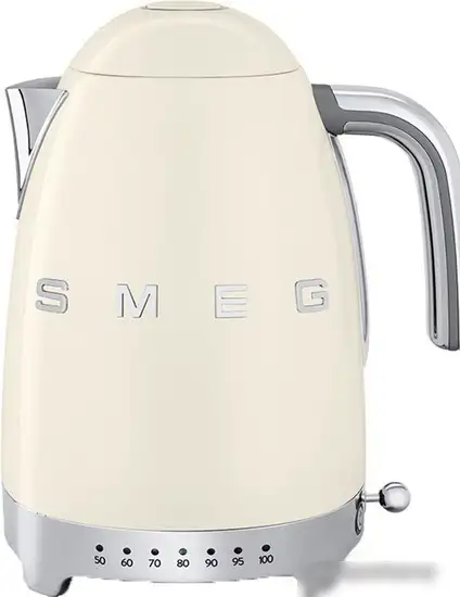 Чайник Smeg KLF04CREU выполнен из нержавеющей стали в красивом кремовом цвете. Он быстро нагревает воду благодаря мощности 2400 Вт и имеет вместимость 1,7 литра. Устройство оснащено вращающейся подставкой на 360°, что облегчает его использование. Чайник поддерживает температуру воды и позволяет долго держать воду теплой. Он также умеет поддерживать температуру после закипания и обеспечить длительный нагрев. Электронное управление делает использование простым и удобным. Прозрачных элементов и подсветки в модели нет, зато есть индикация закипания и температуры. Благодаря надежному материалу и качественной сборке, он отлично подойдет для ежедневного использования. В комплекте нет чашек, что позволяет выбрать свои любимые. Модель сочетает стильный дизайн с хорошими рабочими характеристиками.