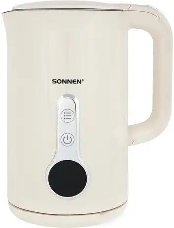 Электрический чайник Sonnen KT-8721 подходит для быстрого кипячения воды дома. Он сделан из прочных материалов: корпус из металла и пластика, внутри – нержавеющая сталь. Мощность устройства составляет 2200 Вт, что позволяет закипятить воду очень быстро. Объем чайника равен 1,7 литра, а его цвет — бежевый, что хорошо вписывается в любой интерьер. Конструкция включает вращающуюся подставку для удобства использования. У чайника есть функция поддержки температуры и терморегулятор с индикатором, чтобы выбрать нужный режим нагрева.