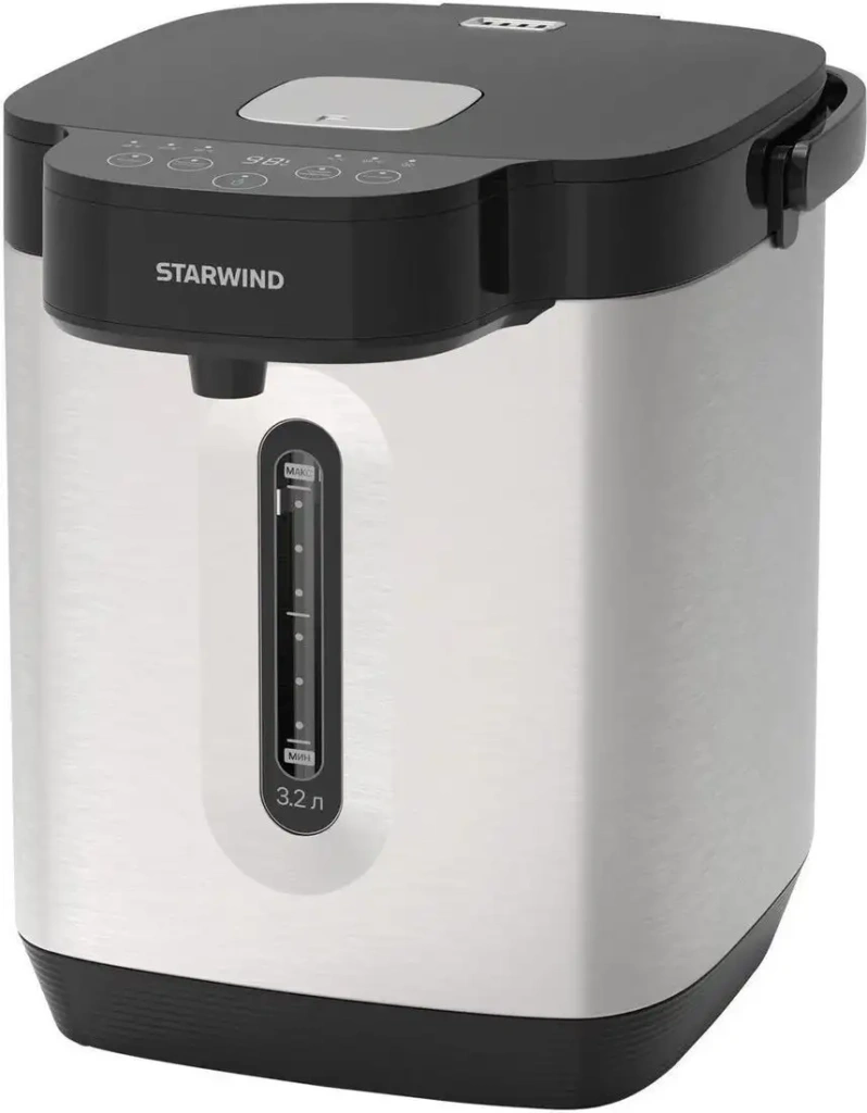 Термопот StarWind STP2725 имеет металлический корпус с пластиком, что обеспечивает прочность и современный внешний вид. Он выполнен из нержавеющей стали и обладает объемом 3,2 литра, что подходит для семьи или офиса. Мощность устройства — 800 Вт, оно быстро нагревает воду и поддерживает нужную температуру. Термопот оснащён электроскопом для отображения уровня воды, а также имеет электромеханический насос для удобного розлива. Вы можете выбрать одну из шести температурных настроек (от 45°C до 100°C) и следить за текущим режимом благодаря индикации. Благодаря функциям длительного кипячения и поддержания температуры, вода всегда будет горячей и готовой к использованию. Управление происходит через электронные кнопки, управление со смартфона отсутствует. Устройство компактное: размеры — 315×255×300 мм, вес — около 2,7 кг. Термопот отлично подходит для ежедневного использования дома или в офисе благодаря простоте и надежности функционала.