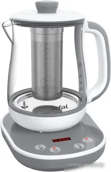 Электрический чайник Tefal BJ551B10 имеет стеклянную колбу и объем 1,5 литра, что достаточно для семейного использования. Он мощный — 1430 Вт, быстро нагревает воду и позволяет заваривать чай. Чайник удобно управляется с помощью электронного управления и оснащен таймером на 0,6 часа. В нем есть терморегулятор с несколькими настройками температуры, от 40°C до 100°C, что помогает выбрать нужный режим для разных напитков. Минимальный уровень воды — 0,5 литра, что предотвращает повреждение прибора при работе. Корпус выполнен в бело-серых тонах, он легко впишется в любую кухню. Подставка вращается, а уровень воды отмечен по бокам для удобства использования.
