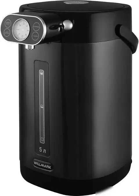 Термопот Willmark WAP-542G обеспечивает быстрое нагревание воды мощностью 1450 Вт и объемом 5 литров. Его корпус выполнен из прочных металлических и пластиковых материалов, а колба сделана из нержавеющей стали, что повышает долговечность. Благодаря двойным стенкам устройство хорошо удерживает температуру воды и защищает от ожогов. Термопот поддерживает выбранную температуру, имеет 5 режимов нагрева (от 35°C до 95°C) и показывает реальную температуру на дисплее. Воду из устройства можно наливать с помощью электрического насоса или механической помпы. Минимальный уровень воды для работы составляет 0,5 литра, а подставка вращается для удобства использования. Устройство управляется с помощью электронной панели, есть встроенное управление температурой и режимами. Оно удобно для домашнего и офисного использования благодаря компактным размерам и весу около 2,3 кг. Внешний уровень воды расположен спереди, что облегчает контроль. Термопот не имеет функций для заваривания и комплектации, как чашки или подсветка воды.