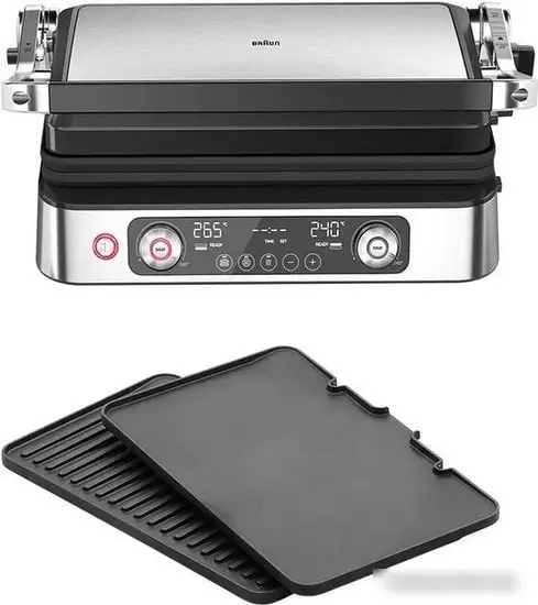Электрогриль Braun MultiGrill 9 CG9140 — это универсальный прибор для приготовления различных блюд. Он обладает мощностью 2200 Вт и двумя типами рабочих поверхностей: гладкой и рифленой, что позволяет готовить мясо, овощи и пироги. Благодаря двум съемным пластинам и поддону для жира его проще очищать и поддерживать в чистоте. В конструкции есть регулировка температуры и таймер, что помогает готовить блюда точно по времени и нужной температуре. Проще управлять грилем можно с помощью автоматических программ, их три. Жесткое закрепление крышки и возможность регулировки его положения делают процесс приготовления более удобным. Этот гриль отлично подходит для домашнего использования, он компактный и выполнен из нержавеющей стали, что обеспечивает долгий срок службы.