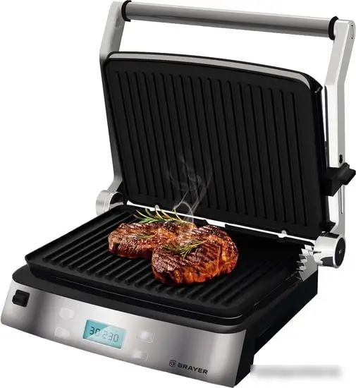 Электрогриль Brayer BR2006 — это универсальный двухсторонний гриль-пресс, который удобно использовать прямо на столе. Он мощностью 2000 Вт быстро нагревается и равномерно прогревает продукты. Благодаря съемной рифленой плите и поддону для жира легко очищать устройство после использования. Гриль позволяет регулировать температуру плавно до 230 °C, что помогает готовить блюда с точным контролем. Таймер с автоматическим отключением через 60 минут обеспечивает безопасность и экономию энергии. В комплект входят две сменные рабочие поверхности и поддон, что расширяет возможности приготовления. Корпус сделан из нержавеющей стали и черного пластика, что придает устройству современный вид. Размеры позволяют удобно хранить гриль и легко его использовать. Он подходит для приготовления различных блюд и отличается надежностью в работе.