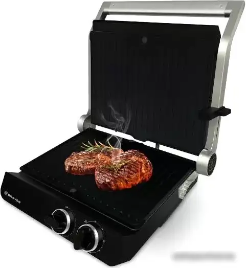 Электрогриль Brayer BR2009 мощностью 2000 Вт подходит для приготовления различных блюд благодаря своей универсальной конструкции. Он имеет двухстороннюю рабочую поверхность — гладкую и рифленую, что позволяет готовить мясо, овощи и другие продукты. Устройство размещается на столе и обладает съемной рабочей поверхностью и поддоном для сбора жира, что облегчает очистку. Гриль позволяет регулировать температуру в 6 ступенях, от 60 до 230 градусов, а также есть таймер для автоматического отключения. Размер рабочей поверхности составляет 330х245 мм, что удобно для семьи или небольшой компании. Он удобно управляется вручную, без необходимости использовать смартфон. Этот гриль — хороший выбор для тех, кто ищет надежное и многофункциональное кухонное устройство.
