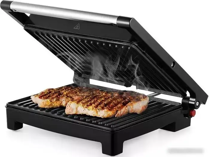 Электрогриль Kitfort KT-3603 предназначен для приготовления разнообразных блюд на одной поверхности с 290x240 мм. Он оснащён мощностью 2000 Вт, что позволяет быстро разогревать и готовить еду. Конструкция двухсторонняя (гриль-пресс) облегчает приготовление мясных, овощных и других блюд, равномерно прожаривая их со всех сторон. Рабочая поверхность выполнена из алюминия с рифлёной структурой, которая помогает сохранить соки и добиться хорошей прожарки. Гриль имеет съемный поддон для жира, что облегчает уборку и делает использование более гигиеничным. Благодаря компактным размерам (длина 336 мм, ширина 350 мм, высота 95 мм), устройство легко разместить на любой стол или рабочую поверхность. Его вес составляет всего 2.6 кг, что упрощает транспортировку и хранение. Встроенные функции включают автоматические программы и регулировку температуры, что помогает достигать оптимальных результатов без лишних настроек. Гриль не имеет таймера, регулировки положения крышки или управления со смартфона, но прост в использовании благодаря своей конструкции.