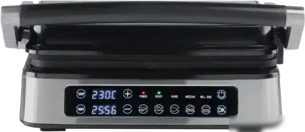 Электрогриль RageX R782-900 мощностью 2000 Вт подходит для приготовления разных блюд. Он имеет двухстороннюю конструкцию, что делает его удобным для быстрого жарки продуктов. Рабочая поверхность выполнена из алюминия с рифлёной поверхностью, что помогает равномерно распределять тепло и предотвращает прилипание. Рабочая поверхность съемная, её легко мыть и менять, а также в комплекте идут две сменные панели и поддон для жира. Гриль регулируется по температуре до 230 градусов, есть таймер и автоматические программы для удобства использования. Верхняя крышка регулируется, что позволяет выбрать нужный режим приготовления. Этот гриль предназначен для использования на столе и выполнен из нержавеющей стали и черного пластика.