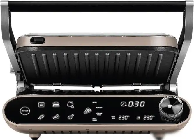 Электрогриль Redmond SteakMaster GM303 — универсальное устройство для приготовления различных блюд. Он имеет двухстороннюю конструкцию, что позволяет быстро и равномерно жарить мясо и овощи. Рабочая поверхность рифлёная, что помогает сохранять соки и придает аппетитный внешний вид блюд. В гриле есть съемная рабочая поверхность и поддон для жира, что облегчает очистку. Вы можете выбрать одну из двух сменных панелей для разнообразия приготовления. Гриль автоматически включает семь программ, а также позволяет регулировать температуру в диапазоне от 80 до 230°C. В устройстве есть таймер для точного контроля времени готовки. Управлять грилем можно легко через сенсорные кнопки, а также при помощи приложения на смартфоне. В комплект входит книга рецептов, руководство и сервисная книжка, что помогает готовить вкусные блюда и поддерживать устройство в исправном состоянии. Этот гриль подходит для самостоятельного приготовления и сервировки на столе.