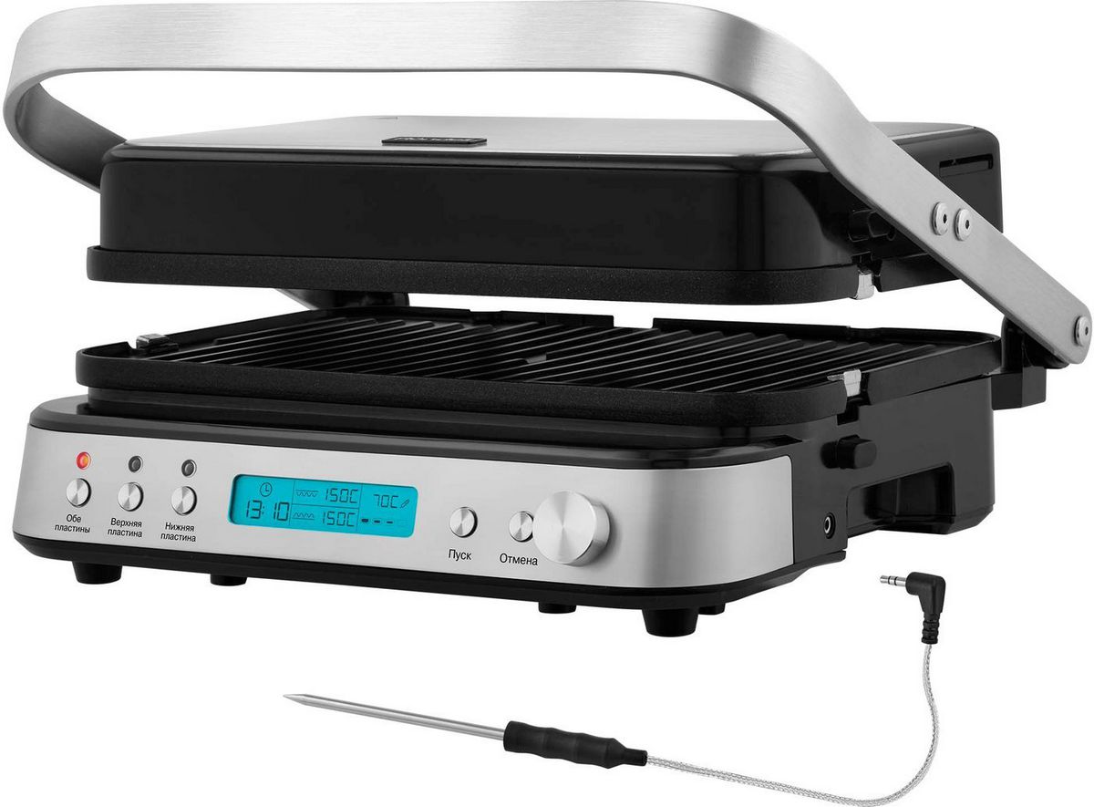 - Регулировка положения верхней крышки — позволяет готовить разные продукты, регулируя пресс.