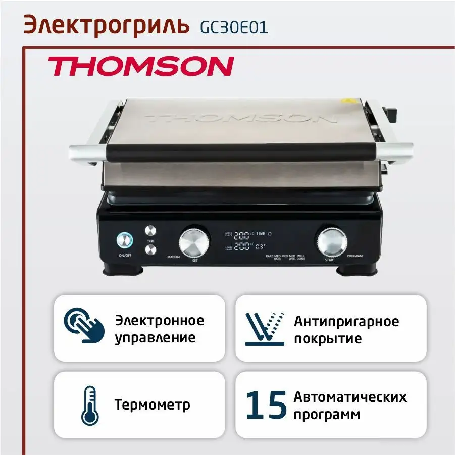 Электрогриль Thomson GC30E01 — это универсальное устройство для приготовления различных блюд. Он мощностью 2000 Вт и двухсторонней конструкцией, которая позволяет готовить быстрее и удобнее. Рабочая поверхность выполнена из рифленой плиты, что способствует равномерному прогреву и красивым полоскам на мясе. В устройстве есть автоматические программы — всего 15 вариантов, а также возможность регулировки температуры и таймера до 99 минут. Это помогает выбрать оптимальные настройки для разных видов блюд. В комплекте есть съемный поддон для жира, скребок и щуп для измерения температуры, что облегчает уход и контроль процесса приготовления. Такой гриль удобно размещать прямо на столе и легко использовать для домашних обедов и ужинов.