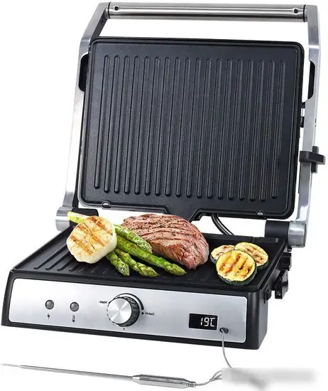 Электрогриль Tuarex TK-5001 — это удобный и простой в использовании прибор для приготовления различных блюд. Он имеет мощность 2400 Вт, что позволяет быстро разогревать поверхность. Гриль выполнен из нержавеющей стали в черном цвете и оснащен двухсторонней рабочей поверхностью с рифленой плитой. Есть съемные части: рабочая поверхность и поддон для жира, что облегчает уборку. Гриль можно регулировать по температуре в диапазоне 150–230°С, что позволяет выбрать подходящий режим. Размеры рабочей поверхности — 294x232 мм, а вес устройства — 3,55 кг. Он предназначен для использования на столе, легко разместится в любой кухне. Он не имеет автоматических программ, но обеспечивает управление температурой для разных видов приготовления.