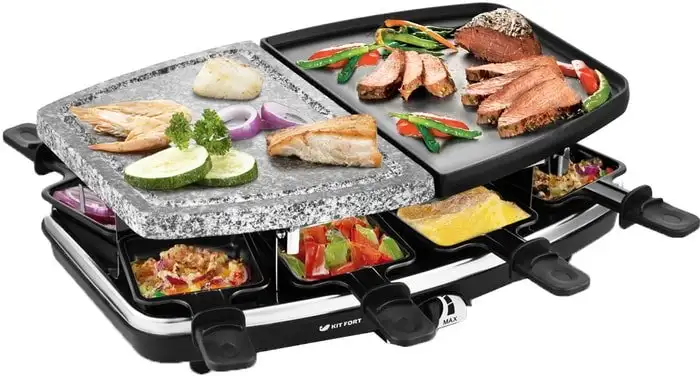 Раклетница Kitfort KT-1649 — это удобный прибор для приготовления вкусных блюд прямо на столе. Она имеет мощность 1200 Вт, что позволяет быстро нагревать поверхность для приготовления. Рабочая поверхность состоит из двух частей: рифленой каменной и гладкой с антипригарным покрытием, что помогает готовить разные блюда. В ракетнице есть 8 порционных сковородок с антипригарным покрытием — удобно для каждого гостя. Вы можете регулировать температуру для разных рецептов, но таймер отсутствует. Размеры конструкции компактны, а вес всего 4,4 кг, её легко хранить и переносить. В комплект входят все необходимые изделия и руководство по эксплуатации, что делает использование еще проще.