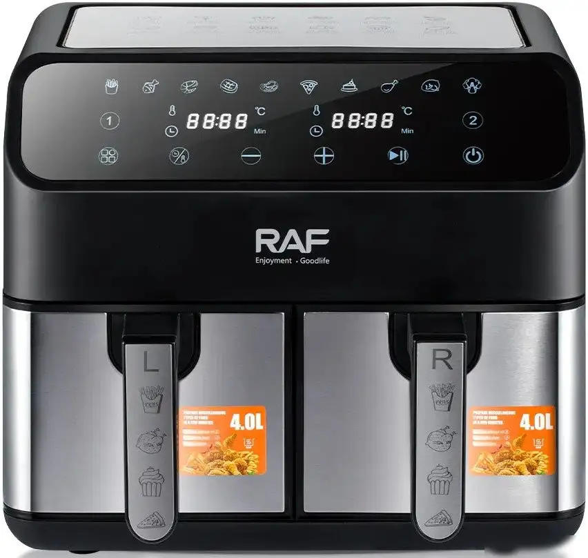 Аэрофритюрница RAF R.5292 легко помогает готовить вкусные блюда благодаря мощность 1000 Вт и рабочему объему 8 литров. Она управляется сенсорной панелью и оснащена таймером, что делает процесс приготовления простым и удобным. Металлический нагревательный элемент обеспечивает быстрый разогрев и стабильный результат. Функциональные программы позволяют автоматически готовить разные блюда без дополнительных настроек. Автоматическое отключение повышает безопасность использования. Регулировка температуры от 80 до 200°C помогает достичь желаемого результата. Кроме того, устройство оснащено функцией автоотключения, которая срабатывает при необходимости, и предназначено для домашнего использования. Его стильный дизайн из нержавеющей стали и черного цвета отлично впишется в любую кухню.