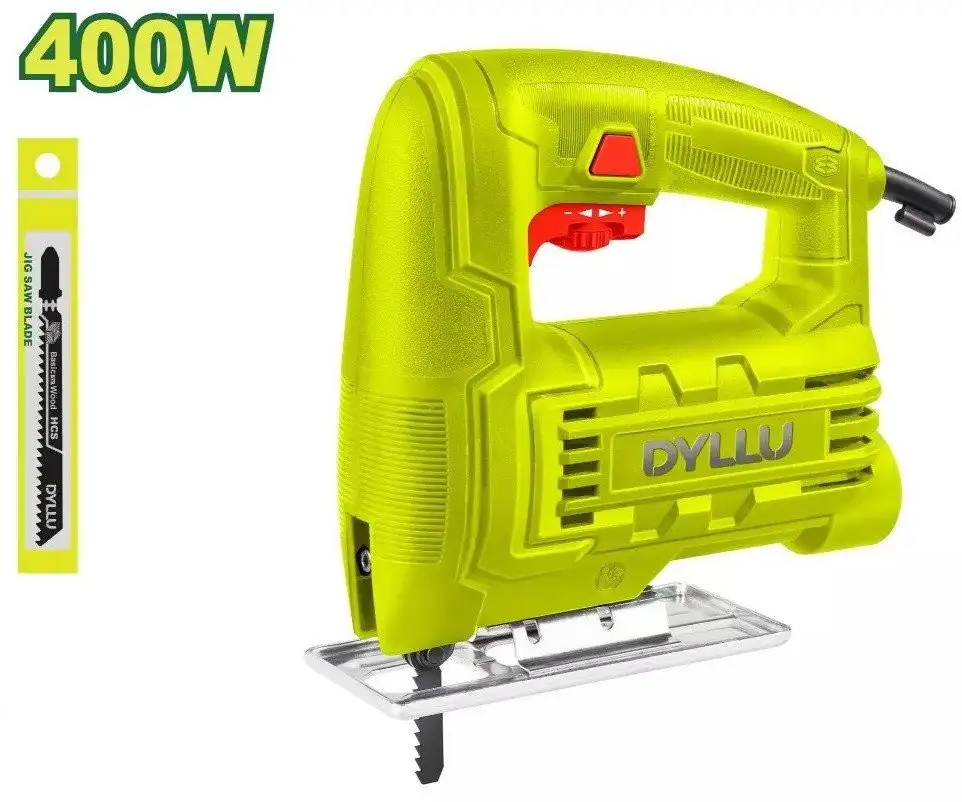 Электролобзик Dyllu DTJS15401 работает от сети и обладает мощностью 400 Вт, что позволяет легко резать дерево до 55 мм и металл до 3 мм. Он лёгкий — всего 1,8 кг, удобно держать и использовать даже продолжительное время. Регулятор скорости помогает подбирать нужную мощность для разных материалов. В комплект входит одно полотно по дереву, ключ для замены пилки и инструкция, всё удобно хранить в коробке. Лобзик можно подключить к пылесосу для быстрого уборки стружки и пыли во время работы.