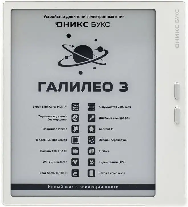 Электронная книга Onyx BOOX Галилео 3 имеет 7-дюймовый цветной экрана на основе технологии E-Ink Carta 1300 с высоким разрешением 1264x1680 пикселей. Она работает на ОС Android 11 и оснащена 3 ГБ оперативной памяти и 32 ГБ внутренней памяти для хранения книг и файлов. Устройство обладает сенсорным мультитачем с подсветкой экрана (MOON Light 2), которая позволяет комфортно читать при любом освещении и регулировать цветовую температуру. Оно поддерживает множество форматов текстовых файлов, а также фото, аудио и архивы, что удобно для разнообразных видов контента. Встроенный динамик и микрофон позволяют прослушивать аудиокниги и делать заметки. Подключение к Wi-Fi и Bluetooth 5.0 обеспечивает быстрый обмен данными и доступ к онлайн-контенту. Для подключения дополнений есть USB Type-C с поддержкой OTG. Устройство компактное, лёгкое — всего 190 г и 6 мм толщиной, что удобно для переноски. В комплект входит чехол-обложка, который защищает устройство при использовании в дороге.
