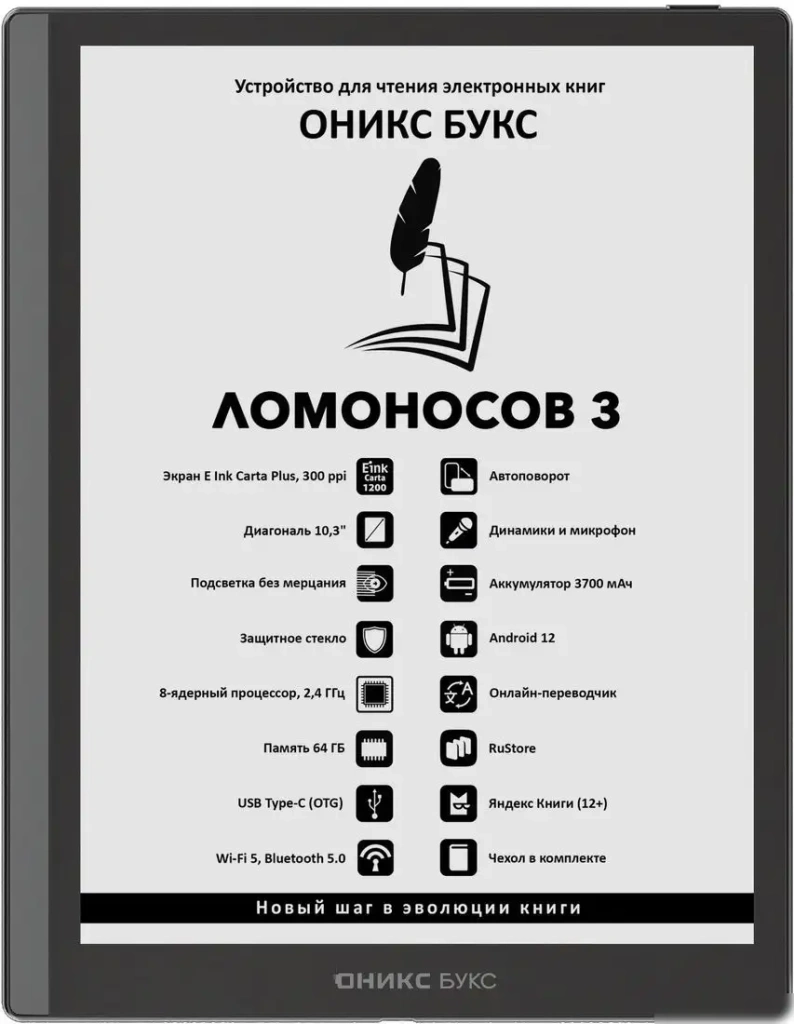 Электронная книга Onyx BOOX Lomonosov 3 оснащена 10.3-дюймовым цветным сенсорным экраном E-Ink Carta Plus с высоким разрешением 1860 x 2480 пикселей, что обеспечивает четкое изображение и комфорт при чтении. Она работает на Android 12, что позволяет устанавливать различные приложения и расширять функциональность устройства. В устройства есть 4 Гб оперативной памяти и 64 Гб встроенной памяти, что позволяет хранить много книг и файлов. Экран подсвечивается с помощью функции Moon Light 2, а также можно регулировать цветовую температуру — так удобно читать в любое время дня и ночи. Электронная книга поддерживает разнообразные форматы текстовых файлов, изображений, аудио и архивов, что делает её универсальным помощником для чтения и прослушивания. Встроенный динамик и микрофон позволяют использовать устройство для мультимедийных задач. Устройство имеет Wi-Fi и Bluetooth 5.0 для быстрого подключения и обмена данными. Благодаря корпусу из пластика и металла и отсутствию пыли и влаги оно надежно и удобно в использовании. В комплект входит защитный чехол, что дополнительно защищает устройство при переноске.
