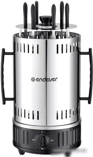 Электрошашлычница Endever Grillmaster-295 предназначена для приготовления шашлыка дома. Она вертикально ориентирована и оснащена шестью шампурами с автоматическим вращением, что помогает равномерно прожарить мясо. Мощность устройства составляет 1100 Вт, а таймер до 30 минут позволяет контролировать процесс готовки. Автоматическое отключение обеспечивает безопасность при использовании. Корпус сделан из нержавеющей стали, что делает его прочным и легко чистится. В конструкцию входит емкость для сбора жира, упрощающая уход за прибором. Механическая панель управления проста в использовании. Размеры устройства: ширина и глубина по 20 см, высота — 40 см, что удобно для установки на кухне. Это устройство идеально подходит для тех, кто хочет быстро и удобно приготовить шашлык дома.