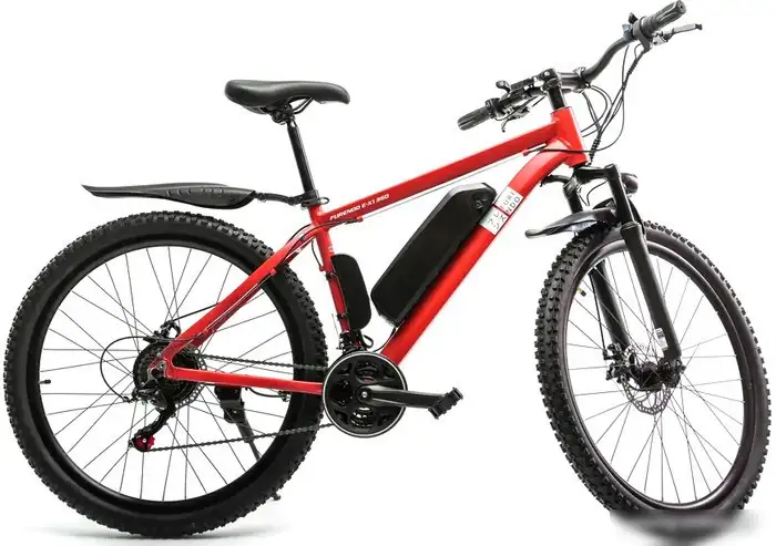 Электровелосипед Furendo E-X1 350 предназначен для езды по бездорожью и городским улицам. Он оснащён прочной алюминиевой рамой красного цвета и амортизационной вилкой, которая смягчает удары и обеспечивает комфорт при прохождении неровностей. Велосипед имеет 21 скорость, которая переключается с помощью триггерных манеток, позволяя легко выбирать нужный режим движения. Надёжные дисковые механические тормоза обеспечивает безопасность при торможении в любых условиях. Колёса диаметром 27,5 дюймов и прочные алюминиевые обода подходят для одновременной ходьбы по асфальту и бездорожью. Встроенный литий-ионный аккумулятор мощностью 36 В и ёмкостью 10.4 А•ч позволяет проехать до 60 км на одной зарядке, а зарядка занимает около 6 часов. Электродвигатель мощностью 350 Вт помогает развивать скорость до 28 км/ч и обеспечивает дополнительную мощность при подъёмах. В комплект входят такие удобства, как звонок, подножка, защитные щитки и фары, что повышает комфорт и безопасность во время поездки.