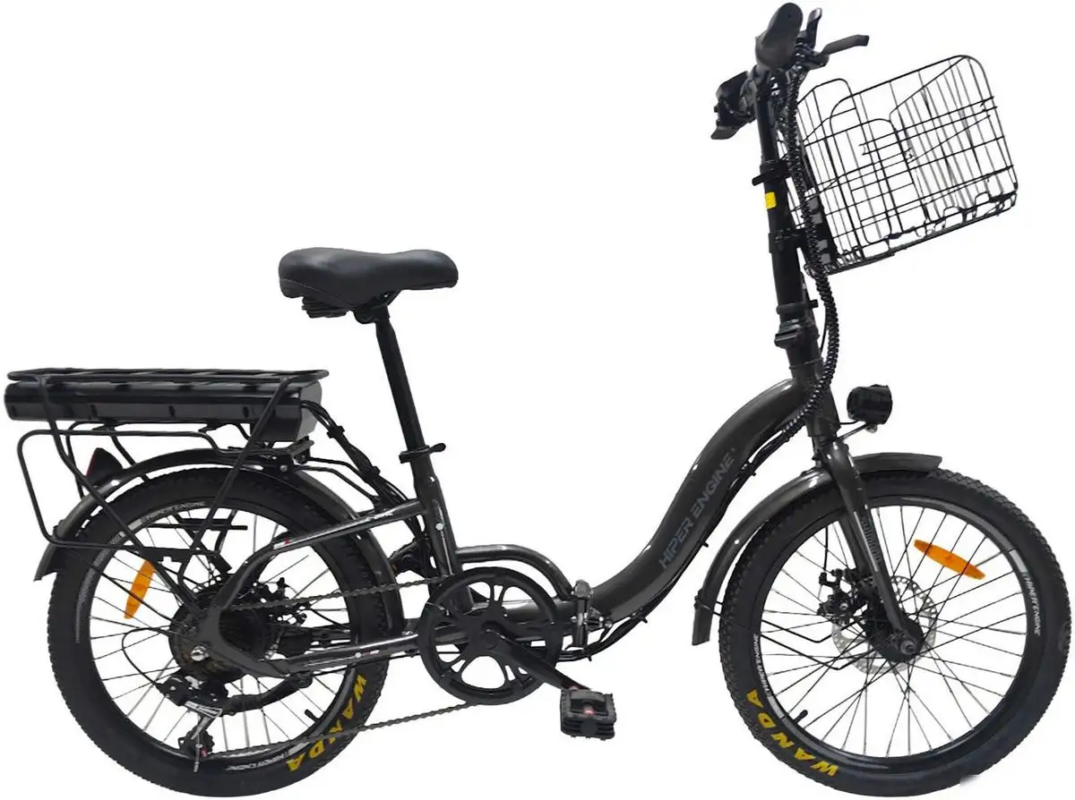 Электровелосипед Hiper Engine Fold X5 2025 — удобное средство для городских поездок. Он имеет прочную стальную раму в графитовом цвете и складную конструкцию, что облегчает хранение и транспортировку. Велосипед оснащён 7-скоростной трансмиссией Shimano для плавного переключения передач. Дисковые механические тормоза обеспечивают безопасность при торможении. Колёсами диаметром 20" с алюминиевыми ободьями и внутри шины шириной 1,95" он отлично подходит для асфальта и дружных дорожек. Встроенный электродвигатель мощностью 250 Вт помогает развивать скорость до 25 км/ч и обеспечивает пробег до 40 км на одной зарядке. Аккумулятор Li-ion с ёмкостью 104 А•ч заряжается примерно за 6 часов и служит до 700 циклов зарядки. Велосипед дополнен передним и задним щитками, защитой цепи, багажником, звонком и фонарём для комфортных поездок. Он подходит для городских условий и весит 25,8 кг, выдерживая нагрузку до 130 кг.