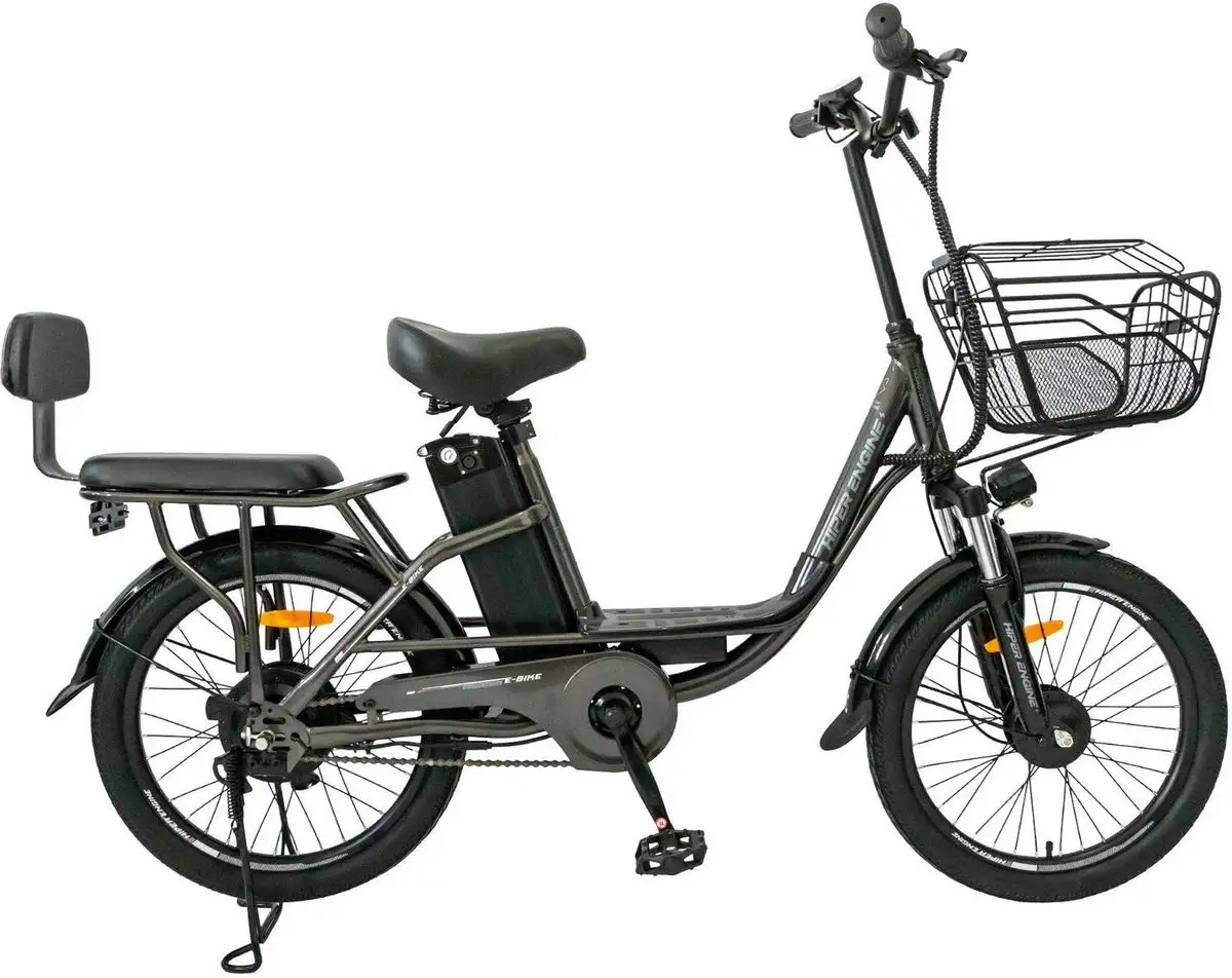 Электровелосипед Hiper Engine Nova D4 2025 имеет прочную стальную раму в стиле графит. Он оснащён амортизационной вилкой, которая поглощает удары и делает поездку комфортной. Велосипед работает на механизме с одной скоростью и надёжных барабанных тормозах для безопасной остановки. Колёса диаметром 20 дюймов из лёгкого алюминия с протектором полуслики обеспечивают хорошее сцепление и управляемость. Устройство оборудовано багажником, защитой цепи, передним и задним щитками, звонком, корзиной спереди и подножкой. Среди его особенностей — встроенный аккумулятор Li-ion с ёмкостью 13 А•ч, который обеспечивает запас энергии до 50 км на одной зарядке и время зарядки около 6 часов. Электровелосипед оснащён мощным 500 Вт двигателем, развивающим скорость до 45 км/ч, и имеет систему внутренней проводки для защиты кабелей. Также есть передний свет и другие элементы безопасности для удобства использования. Это устройство отлично подойдёт для городских поездок и прогулок.