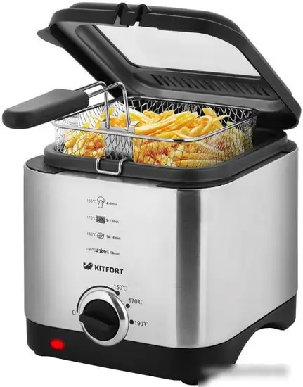 Фритюрница Kitfort KT-2017 выполнена из нержавеющей стали и черного пластика, что делает её прочной и стильной. Она работает мощностью 900 Вт и имеет объем чаши 1,5 литра, что подходит для приготовления небольших порций. Устройство оснащено смотровым окном, позволяющим следить за процессом готовки, и фильтром против запаха, который избавляет от неприятных запахов на кухне. Регулировка температуры позволяет выбрать нужный режим от 0 до 190°C для разных видов продуктов. Корпус выполнен из металла и пластика, обеспечивая долговечность эксплуатации. Фритюрница не имеет съемной чаши и таймера, поэтому приготовление требует контроля со стороны пользователя. Устройство не оборудовано отделением для хранения шнура, что может потребовать дополнительного места при хранении. В целом, эта модель подходит для тех, кто ищет простую фритюрницу с основными функциями и аккуратным дизайном.