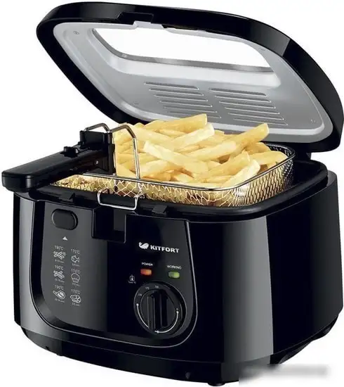 Фритюрница Kitfort KT-2018 — это устройство в черном цвете, которое удобно использовать дома. Она имеет мощность 1 800 Вт и объем чаши 2,5 литра, что подходит для приготовления порционных блюд и закусок. Корпус сделан из пластика, он легкий и прочный. В конструкции есть смотровое окно, позволяющее следить за процессом приготовления без открытия. Фритюрница оснащена фильтром против запаха, который помогает уменьшить неприятные ароматы в помещении. Регулировка температуры варьируется от 0 до 190 °C, поэтому можно готовить разные блюда с точным контролем. Устройство не имеет съемной чаши и таймера, но простое в использовании. Нет отделения для хранения шнура, что немного ограничивает хранение. Этот аппарат подходит для тех, кто ищет простую и надежную фритюрницу для домашнего использования.