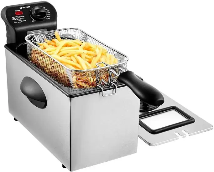 Фритюрница Kitfort KT-2023 выполнена из нержавеющей стали, что делает её прочной и устойчивой. Она работает на мощности 2180 Вт и позволяет легко готовить вкусные блюда во фритюре. Вместительная чаша объёмом 3.3 литра справляется с приготовлением пищи для всей семьи, а общий объём достигает 5.8 литров. Устройство оснащено съемной и полностью разборной чашей, что облегчает её мытьё и уход за ней. Внутри фритюрницы есть смотровое окно, позволяющее контролировать процесс приготовления, без открытия крышки. Фильтр против запаха помогает уменьшить неприятные ароматы в помещении при готовке. Регулировка температуры от 130 до 190 °C обеспечивает точный контроль процесса приготовления. Фритюрница не оснащена таймером или отделением для хранения шнура, что упрощает её использование и хранение.