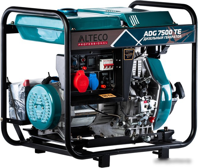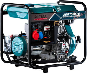 Дизельный генератор Alteco ADG 7500 TE предназначен для тяжелых работ и обеспечивает надежное электроснабжение. Он работает на дизельном двигателе объемом 523 см³ и имеет максимальную мощность 6.2 кВт, а номинальная — 5 кВт. Генератор оснащен тремя фазами и розетками 380 В, что позволяет подключать разные электроприборы. Он запускается как ручным, так и электростартером, а воздушное охлаждение обеспечивает стабильную работу. Топливный бак на 12.5 литров позволяет длительно работать без дозаправки, расходуя 3.1 литра топлива в час. Устройство обладает уровнем шума 77 дБА и весит около 100 кг, что делает его мощным и надежным. Благодаря компактным размерам легко перемещать и использовать в разных условиях. Этот генератор подходит для промышленного применения и стройплощадок.