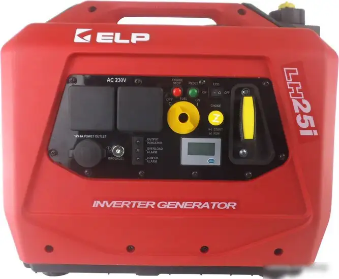 Бензиновый генератор ELP LH25i в ярко-красном цвете — это портативное устройство, которое легко переносить и использовать в разных условиях. Он работает на четырехтактом двигателе с воздушным охлаждением и имеет топливный бак объемом 5 литров, что позволяет непрерывно работать до 20 часов. Максимальная мощность генератора достигает 2.4 кВА, а активная — 2.4 кВт, что подходит для питания различных бытовых приборов. Генератор оснащен индикатором уровня топлива, защитой от перегрузки и вольтметром для контроля работы. Он обладает невысоким уровнем шума — всего 59 дБА при 7 метрах, и его вес составляет около 20 кг, что делает его удобным для переноски и использования на выезде.