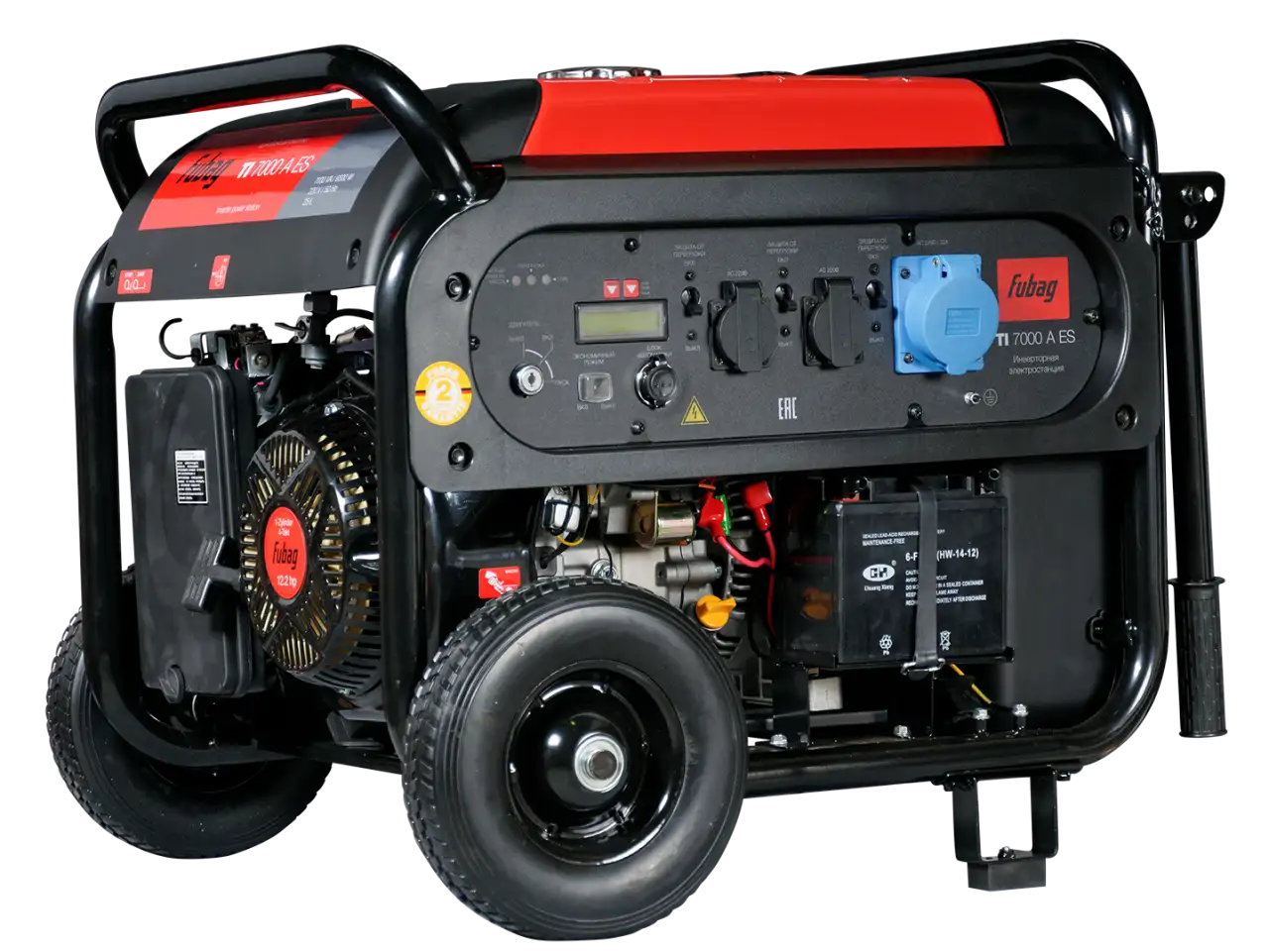 Бензиновый генератор Fubag TI 7000 A ES — это удобный переносной источник электроэнергии, который работает на бензине А-92. Его двигатель внутреннего сгорания работает четырьмя тактами и обеспечивает продолжительную работу до 7,5 часов при низком расходе топлива. Генератор имеет мощность до 7 кВА, что подходит для различных бытовых и небольших промышленных нужд. Он оснащен инверторным генератором и розетками на 220 В и 380 В, что позволяет подключать разные виды техники. В конструкции есть электростартер для быстрого запуска и индикатор низкого уровня масла. Такой генератор легко переносить благодаря компактным размерам и весу около 92 кг. Он также работает тихо — уровень шума составляет 65 дБА на расстоянии 7 метров.
