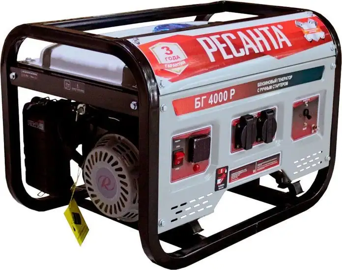 Бензиновый генератор Ресанта БГ 4000 Р предназначен для подачи электроэнергии в различных условиях. Он оснащён четырёхтактным двигателем объёмом 163 см³, который обеспечивает стабильную работу. Генератор имеет открытый корпус и работает на топливе из 15-литрового бака, что позволяет долго использовать его без дозаправки. Максимальная активная мощность достигает 3 кВт, что подходит для питания бытовых приборов. Он оснащён синхронным генератором с одной фазой и двумя розетками на 220 В по 16 А для подключения устройств. Устройство легко запускается ручным механизмом и охлаждается воздушным способом. Уровень шума составляет 66 дБ, что не слишком мешает при использовании. Генератор снабжён индикатором уровня масла и защитой от перегрузки, что обеспечивает безопасную работу. Его вес равен 40,8 кг, а габариты позволяют легко перевозить или хранить.