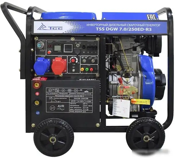 Дизельный генератор ТСС DGW 7.0/250ED-R3 подходит для промышленных и строительных работ благодаря своей надежности и мощностью. Он имеет открытый монтаж и оснащен сварочным генератором, что обеспечивает дополнительную функциональность. Максимальная мощность достигает 7 кВА, а номинальная — 6,5 кВА, что позволяет управлять различными нагрузками. Генератор оснащен трехфазными розетками 220 В и 380 В, а также индикаторами уровня топлива и масла для удобства эксплуатации. В устройстве установлен четырехтактный двигатель внутреннего сгорания модели 192F с объемом 498 см³ и емкостью топливного бака 12,5 л, он расходует около 1,9 л топлива в час при 75% нагрузки. Вследствие воздушного охлаждения уровень шума составляет 77 дБА. Генератор легко перемещать на колесах благодаря встроенным колесам и компактным габаритам (610х710х470 мм), а вес составляет 119 кг. Он защищен от перегрузки, а запуск осуществляется электростартером для быстрой и удобной работы.