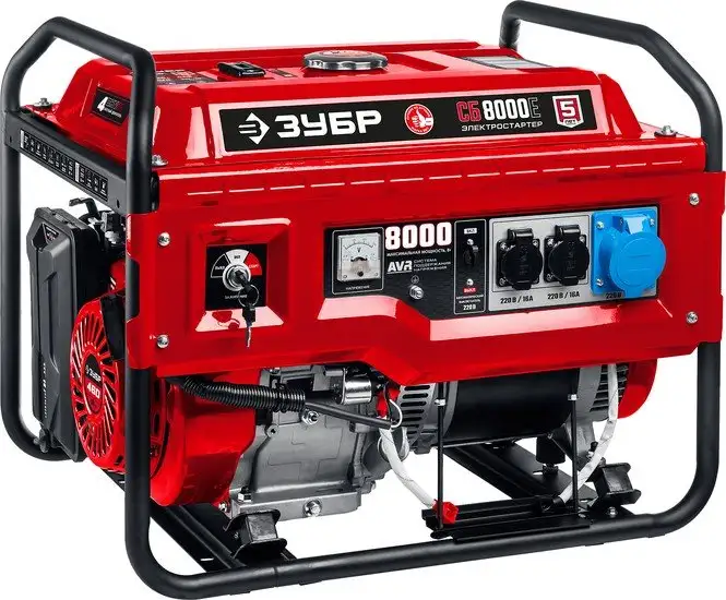 Бензиновый генератор Зубр СБ-8000Е — это мощное устройство для работы в различных условиях. Он работает на бензине и имеет двигатель объемом 460 см³, что позволяет ему выдавать до 8 кВт максимальной мощности. Генератор оснащен электростартером для удобного запуска и воздушным охлаждением двигателя. В баке можно залить 25 литров топлива, что обеспечивает длительную работу без дозаправки. Для безопасности есть защита от перегрузки и индикатор уровня топлива. Устройство оснащено 16 автоматическими розетками на 220 В и одной на 380 В. Вес генератора — 91 кг, размеры позволяют его разместить на складе или в мастерской.