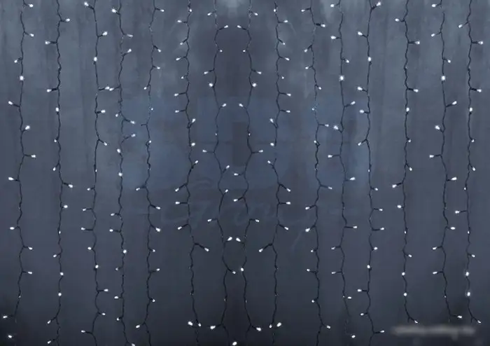 дождь (занавес), длина 2 м, 1500 ламп, свечение постоянное, IP44, 90 Вт, провод прозрачный ПВХ
