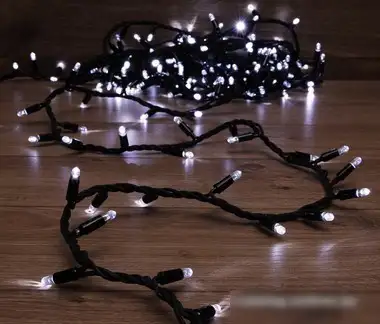 гирлянда, для использования в помещении/на улице, длина 10 м, 100 ламп, питание от сети, свечение мерцающее, IP65, провод черный резиновый