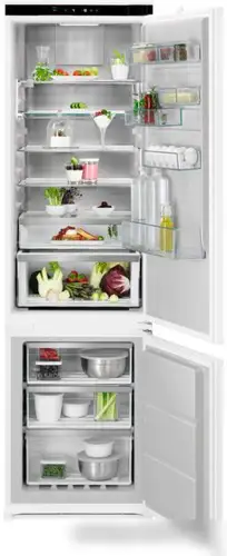 Холодильник AEG NSC8M191DS — это встраиваемое устройство с низкой нижней морозильной камерой и системой No Frost, которая предотвращает образование льда. Он оснащён одним компрессором и электронным управлением с внешним дисплеем, позволяющим легко контролировать температуру. В холодильной части расположено пять полок и пять дверных балконов, а также ящик для овощей и фруктов для сохранения свежести продуктов. Морозильная камера имеет три отделения и объём 62 литра, что удобно для хранения замороженных продуктов. В холодильнике есть функции суперзаморозки, суперохлаждения, а также режимы отпуска и сигнал открытия двери для удобства использования. Благодаря перенавешиваемым дверям устройство легко адаптировать под разные кухни. Он работает тихо с уровнем шума всего 35 дБ и соответствует классам энергоэффективности D и климатическому классу SN, N, ST, T.