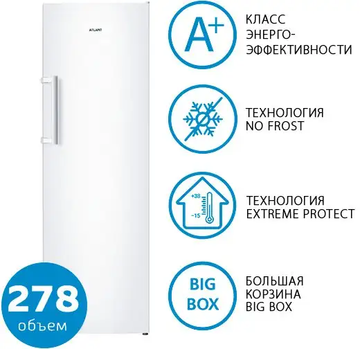 Морозильник ATLANT М 7606-100 N — это надежная модель, которая подойдет для хранения большого количества продуктов. Он имеет общий объем 278 литров, из которых 245 литров доступны для хранения. Благодаря системе No Frost, вам не придется регулярно размораживать устройство. В морозильнике есть 8 отделений и светодиодное освещение, которое удобно освещает все продукты внутри. Управление электронное и интуитивно понятное, а индикатор температуры показывает текущий режим. В отличие от многих моделей, он работает тихо — уровень шума составляет всего 43 дБ.