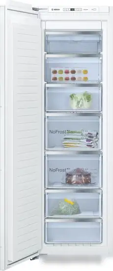 Морозильник Bosch Serie 4 GIN81AEF0 встраиваемый и белого цвета. Он имеет систему No Frost, которая не требует ручной оттаивки и помогает избежать наледи. Внутри есть семь отделений, и общий полезный объём морозильной камеры составляет 212 литров, что подходит для хранения большого количества продуктов. Управление осуществляется через электронный дисплей с индикаторами температуры. Устройство работает довольно тихо, уровень шума — всего 36 дБ. Есть функции как суперзаморозка и сигнал открытия двери, что помогает сохранить свежесть продуктов и предупредить о неисправностях.