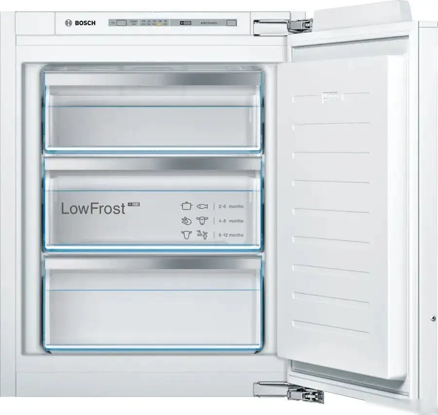 Морозильник Bosch Serie 4 GIV11AFE0 — компактное встроенное устройство, которое идеально впишется в кухню. Он оснащён тремя отделениями для хранения, что позволяет удобно располагать продукты. Общий полезный объём составляет 72 литра, а управление осуществляется сенсором внутри камеры. Морозильник работает без системы No Frost, поэтому достаточно его разморозить вручную. Он быстро замораживает продукты благодаря режиму суперзаморозки и сообщает о открытой двери. Устройство обладает низким уровнем шума — всего 36 дБ, что не мешает работе и отдыху. Предназначен для использования в неотапливаемых помещениях с климатическими классами SN, N, ST и T. Благодаря классу энергоэффективности E он расходует около 167 кВт·ч электроэнергии в год. Внутренний дисплей показывает текущую температуру и обеспечивает лёгкое управление. Такой морозильник — практичное решение для компактных кухонь, заботясь о свежести продуктов.