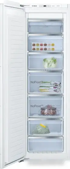 Морозильник Bosch Serie 6 GIN81AEF0U — встроенное устройство с системой No Frost, которая предотвращает образование льда и облегчает уход за ним. Он оснащён одним компрессором и семью отделениями, что позволяет удобно организовать хранение продуктов. Общий объём камеры — 235 л, из них 211 л — полезная площадь для заморозки. Управление осуществляется electrónно, внутри находится светодиодный дисплей с индикацией температуры. Устройство работает очень тихо — уровень шума всего 36 дБ, и потребляет примерно 294 кВт·ч в год. Благодаря инверторной технологии морозильник быстро достигает выбранных настроек и сохраняет энергию. Функции суперзаморозки и сигнал о открытой двери помогают сохранить продукты свежими и обеспечить безопасность. В стандартной нише его легко встроить — ширина 56 см, высота 177,2 см. Морозильник обладает переносимыми дверями и компактной конструкцией, что делает его удобным для любой кухни.
