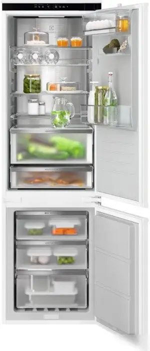 Холодильник Electrolux ENV9MC18S — встроенное устройство с нижней морозильной камерой. Он имеет полный No Frost, что означает отсутствие льда и необходимости ручной разморозки. В холодильной части размещено 165 литров полезного объёма, в морозильной — 62 литра. Устройство оснащено четырьмя стеклянными полками и тремя дверными балконами для удобного хранения. Внутри есть ящик для овощей и фруктов, а также полка для вина и лоток для яиц. Управление осуществляется сенсорным дисплеем с базовой индикацией температуры и режимами суперохлаждения, суперзаморозки и отпуск. Устройство работает тихо — уровень шума не превышает 35 дБ, и обладает энергоэффективностью класса C. Оно легко устанавливается благодаря переносным дверям и скользящим направляющим. В комплект входит встроенная ручка для комфортного открытия. Этот холодильник подходит для тех, кто ценит надёжность и современные функции.