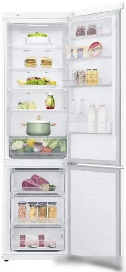 Холодильник LG GA-B509SQKL — это вместительный и надежный агрегат, предназначенный для хранения продуктов. Он выполнен в белом цвете и занимает немного места благодаря компактным размерам: шириной 59,5 см, глубиной 68,2 см и высотой 203 см. Оснащен одним компрессором и системой No Frost, которая избавляет от необходимости разморозки. Основная камера объемом 292 л и морозильная на 127 л позволяют удобно разместить продукты всей семьи. Управление осуществляется через внешний светодиодный дисплей, имеется режим "ECO" для энергосбережения и блокировка от детей. В холодильнике есть ящик для овощей и фруктов с возможностью регулировки влажности, а также специальная полка для вина. Технология DoorCooling+ обеспечивает охлаждение на 32% быстрее, что помогает сохранять свежесть продуктов дольше. Инверторный компрессор и класс энергоэффективности A+ обеспечивают низкий расход электроэнергии и тихую работу — всего 36 дБ. Также есть суперохлаждение и суперзаморозка для быстрого охлаждения продуктов. Этот холодильник отлично подходит для тех, кто ценит качество, надежность и современные функции.