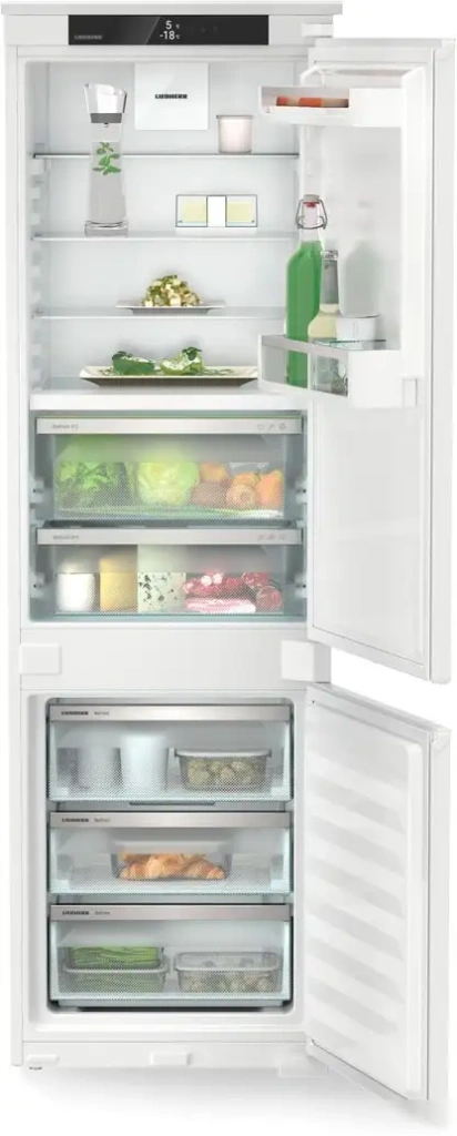 Холодильник Liebherr ICBNSd 5123 Plus BioFresh NoFrost — это встроенное устройство с немецким качеством. Он имеет удобную электронную систему управления и сенсорный дисплей, что облегчает настройку температуры и режимов. В холодильной части есть четыре стеклянные полки и две дверных полки, а также ящик для овощей и фруктов с регулируемой влажностью. Мо́розильная камера разделена на три отделения и оснащена системой No Frost, поэтому не требует разморозки. Объем холодильной камеры составляет 190 литров, а морозильной — 83 литра, что позволяет хранить много продуктов. Устройство использует класс энергоэффективности A++ и работает тихо, уровень шума — 36 дБ. Встроенный блок управления размещен внутри, предусмотрены функции суперзаморозки и суперохлаждения для быстрого охлаждения продуктов. Также есть режим ECO, сигнал открытия двери и блокировка от детей для дополнительной защиты. Этот холодильник подходит для тех, кто ценит качество, энергоэффективность и удобство использования.