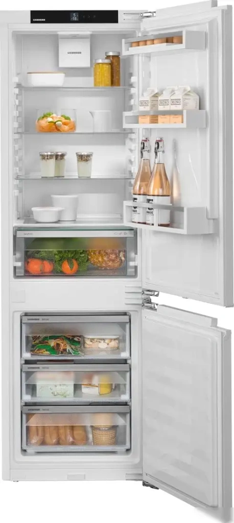 Холодильник Liebherr ICNf 5103 Pure NoFrost — это встроенное устройство с нижней морозильной камерой, выполненное в белом цвете. Он оснащён системой No Frost, которая избавляет от необходимости размораживания. В холодильной части находится 4 полки из стекла, три дверных балкона и один ящик для овощей с регулировкой влажности. Общий объём холодильной камеры — 190 литров, а морозильной — 83 литра, что обеспечивает достаточно места для хранения продуктов. Управление происходит с помощью сенсорной панели внутри и ЖК-дисплея, на котором видно текущую температуру. В функции входят суперзаморозка, суперохлаждение, режим ECO и блокировка детей. Устройство работает тихо — уровень шума всего 37 дБ и соответствует классEnergy A+. Помимо этого, есть антибактериальный фильтр для защиты продуктов и перерабатываемые двери, что повышает удобство использования. Размеры позволяют легко встроить холодильник в стандартную кухонную нишу.