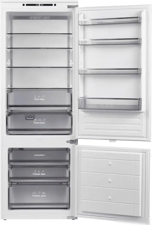 Холодильник MAUNFELD MBF193NFW1GR — это встраиваемая модель с нижней морозильной камерой, выполненная в белом цвете. Он оснащён системой No Frost, которая не требует ручной разморозки, и электронным управлением с дисплеем для удобства настройки. Внутри есть 4 полки из стекла и 4 дверных балкона, что позволяет удобно организовать пространство. Объём холодильной части составляет 257 литров, с зоной свежести объёмом 35 литров для хранения овощей и фруктов с регулируемой влажностью. Морозильная камера имеет 3 отделения и ёмкость 84 литра, с возможностью быстрой заморозки 3,8 кг продуктов в сутки. Модель обладает функциями суперзаморозки, суперохлаждения, режимом ECO и сигналом при открытой двери. Устройство работает тихо, уровень шума — 41 дБ, и соответствует классу энергоэффективности А+. Особенностью является перенавешиваемая дверь, что упрощает установку. Размеры и дизайн позволяют удобно встроить холодильник в кухонный гарнитур.