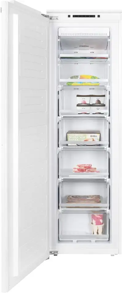 Морозильник MAUNFELD MBFR177NFW — встраиваемое устройство с классическим дизайном в белом цвете. Он оснащён системой No Frost, которая предотвращает образование льда и облегчает уход за техникой. Общее пространство составляет 203 литра, из которых 200 литров — полезный объём для хранения продуктов. Морозильник имеет семь отделений и может замораживать до 10 кг продуктов в сутки. Управление происходит при помощи электронного дисплея внутри, что позволяет легко настроить температуру и включить режимы. В конструкции предусмотрены перенавешиваемые двери, что удобнее при установке. Устройство работает тихо — уровень шума составляет всего 41 дБ и обладает высоким классом энергоэффективности A+. Морозильник подходит для встраивания в ниши высотой около 178 см и шириной 56 см. Его легко обслуживать благодаря простому управлению и эффективной работе системы.