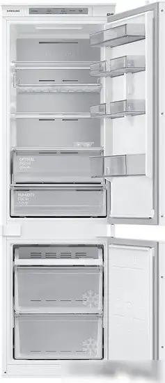 Холодильник Samsung BRB26705DWW/EF — это встраиваемая модель с белым корпусом и системой No Frost, которая избавляет от необходимости размораживать морозильник вручную. Он имеет одну ручку компрессора и электронное управление с внешним светодиодным дисплеем, показывающим текущую температуру. В холодильной части общее пространство составляет 190 литров, а в морозильной — 74 литра. В холодильнике размещены 3 полки из стекла, 6 дверных балконов и ящик для овощей, что позволяет удобно хранить продукты. Морозильная камера может замораживать до 6 кг в сутки и оснащена двумя отделениями для заморозки. Модель включает функции суперзаморозки, суперохлаждения, а также возможность регулировки температуры и сигнал о открытой двери. Управление осуществляется снаружи, а уровень шума составляет всего 35 дБ, что делает его тихим в использовании. Благодаря инверторной технологии холодильник потребляет примерно 185 кВт·ч в год и работает довольно экономично и тихо. Его размеры идеально подходят для встроенного монтажа, а скользящие направляющие помогают удобно закрепить мебельный фасад.