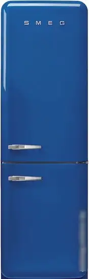 Холодильник Smeg FAB32RBE5 — это стильное устройство с синим цветом и ретро-дизайном. Он свободностоящий и оснащён одной нижней морозильной камерой, которая разделена на три отделения и имеет общий объём 97 литров. В холодильной части расположены три стеклянных полки и ящик для овощей с регулировкой влажности. Управление электронное, его удобно осуществлять через LED-дисплей, а функция «ECO» помогает снизить расход энергии. Благодаря полной системе No Frost вам не придётся размораживать его вручную. Встроенный блок управление находится внутри, есть сигнал о открытой двери и режимы «Отпуск» и «Суперохлаждение» для ускоренного охлаждения. Устройство работает тихо — всего 37 дБ, а класс энергоэффективности — A+++. Для сохранения свежести продуктов предусмотрена зона свежести и функция суперзаморозки. Монтаж осуществляется без ручек, а дверь открыть можно только справа, что важно учитывать при размещении.