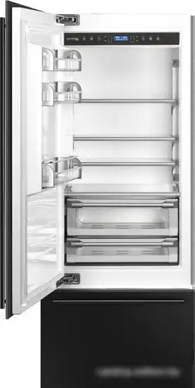 Холодильник Smeg RI76LSI — встроенное устройство с классическим белым дизайном и вместительностью 425 литров. Он имеет одну морозильную камеру с двумя отделениями и генератором льда, что удобно для хранения продуктов и льда. В холодильной части расположено 4 полки из стекла и три дверных балкона, а также ящик для овощей и фруктов с регулировкой влажности. Управление осуществляется электронным блоком внутри, есть ЖК-дисплей и индикатор температуры для удобства. Холодильник поддерживает режим «Отпуск» и имеет функцию суперохлаждения и суперзаморозки для быстрого охлаждения продуктов. Он работает тихо — уровень шума всего 41 дБ — и отличается высокой энергоэффективностью класса A+. Можно настроить независимую температуру в зонe свежести, а также использовать таймер Bottle Cooler. Встроенные функции повышают комфорт при использовании и помогают сохранить продукты свежими дольше.